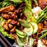 Start with a scoop of steamed jasmine rice at the bottom of your bowl. Then take two butter lettuce leaves (Bibb works too) and fill them with the chicken mixture. Place them right on top of the rice.